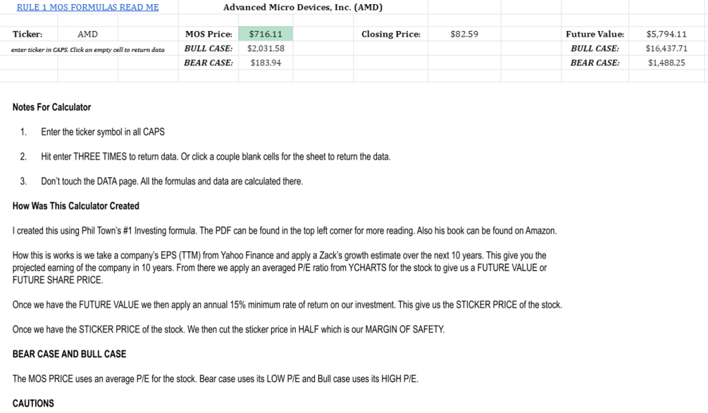 You'll get a copy of this spreadsheet calculator to use forever. Simply plug in your ticker symbol and let it calculate a Margin of Safety price for you.
